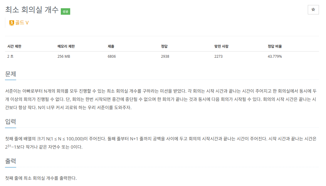 어제 풀었던 것과 마찬가지로 우선순위 큐를 이용하는 문제다. 회의 배열의 크기와 주어질 수 있는 시간의 최대값이 충분히 작다면 배열 하나와 브루트 포스를 이용할 수도 있겠지만, 이 문제는 그러기엔 큰 수들이 주어질 수 있다.