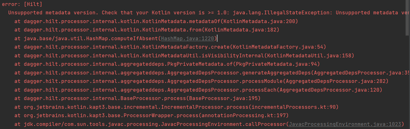 일단 프로젝트 수준 build.gradle.kts에 hilt-android-gradle-plugin을 추가하고 다시 실행했지만, 여전히 같은 에러가 발생했고 이번엔 세부 에러를 살펴보기로 했다.