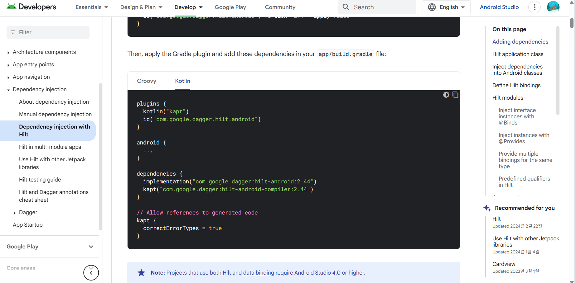 kapt 관련 플러그인을 잘못 설치했나 싶어서, Android Developers의 Hilt 레퍼런스를 참조해 가며 비교했는데 똑같이 구현한 상태였다. 이상하다 싶었는데, IDE에서 Hilt의 버전을 레퍼런스처럼 2.44가 아닌 2.48로 추천하고 있길래 변경해주었더니 그냥 해결되었다..