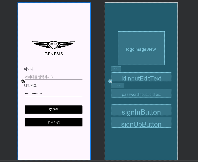 GuideLine 위젯을 이용해 기준점이 되는 constraint 지점으로 삼아, 디스플레이의 세로 비율이 조금 길어지거나 짧아지더라도 중앙을 중심으로 모여있도록 했다. 물론 모든 비율에 대응할 수 있도록 한 건 아니라서, 가로로 일정 비율 이상 길어지는 경우 이미지의 크기를 고정한 것 때문에 문제가 생긴다. 사실 이건 LandScape 상태의 레이아웃을 따로 만들어 줘야 하는 문제에 가깝지만..