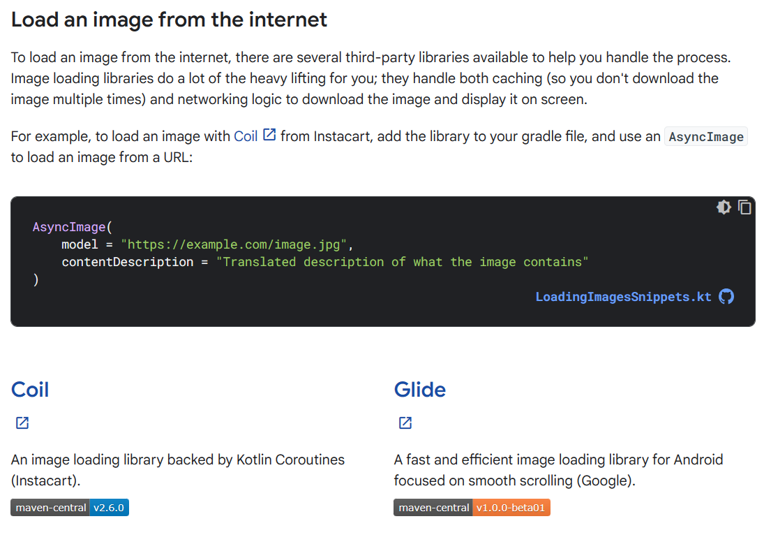 어제 고민했던 이미지 로더는, Coil을 이용해 적용했다. 내부 이미지 로더는 네트워크에서 받아오는 용도로 쓸 수 가 없었고, 공식 문서에서도 Glide나 Coil을 권장하고 있었다. Coil에선 AsyncImage를 통해 Compose에 좀 더 편하게 적용 가능하기도 했다.