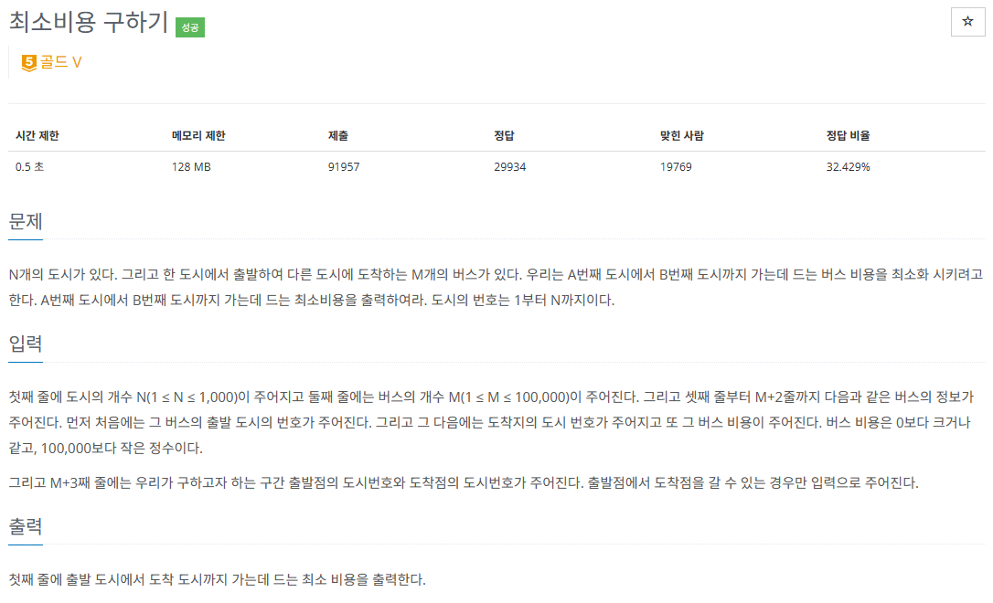 가중치가 음수인 간선이 없고, 시작점이 고정된 상태에서 최단 경로를 구하는 문제라 다익스트라 알고리즘으로 풀 수 있고, 가장 심플한 형태이다. 정점이라고 할 수 있는 도시의 개수가 1,000개 이하로 주어지기 때문에 O(V^2)의 시간복잡도로 풀어도 무방하겠지만, 굳이 그렇게 구현할 이유는 없으므로 우선순위 큐를 사용해 O((V+E)logV)의 시간복잡도로 풀었다.