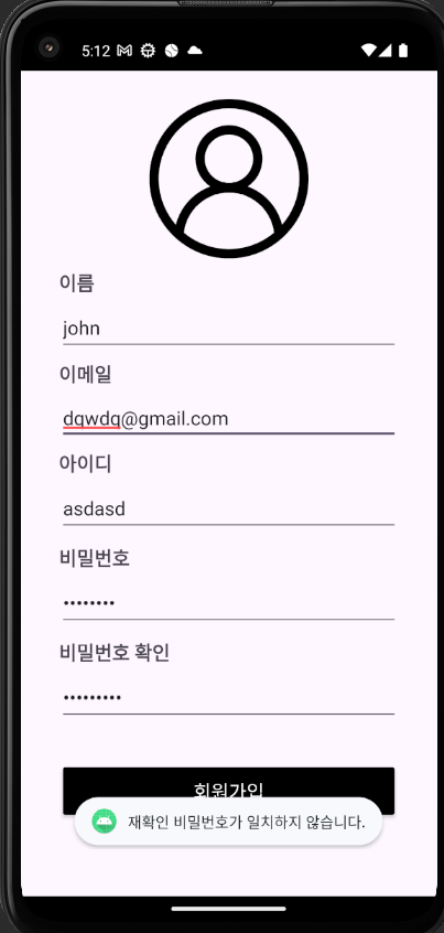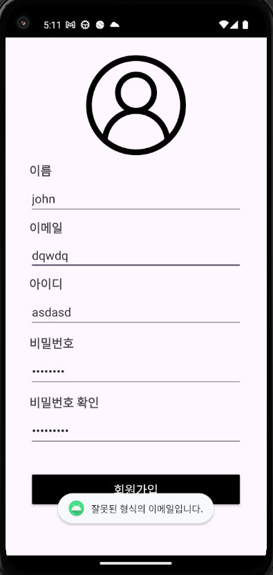 본 과제의 요구사항에 따라, 기존의 코드에서는 Validation이라고 해야 Activity 내에서 각 항목이 빈 칸인지 정도만 확인하고 있었다. 하지만 챌린지반 4주차 내용에서는 각 항목들이 입력되었는지, 비밀번호 길이 등의 제약 확인, 비밀번호 재확인, 이메일 유효성 검증을 요구하고 있었다.