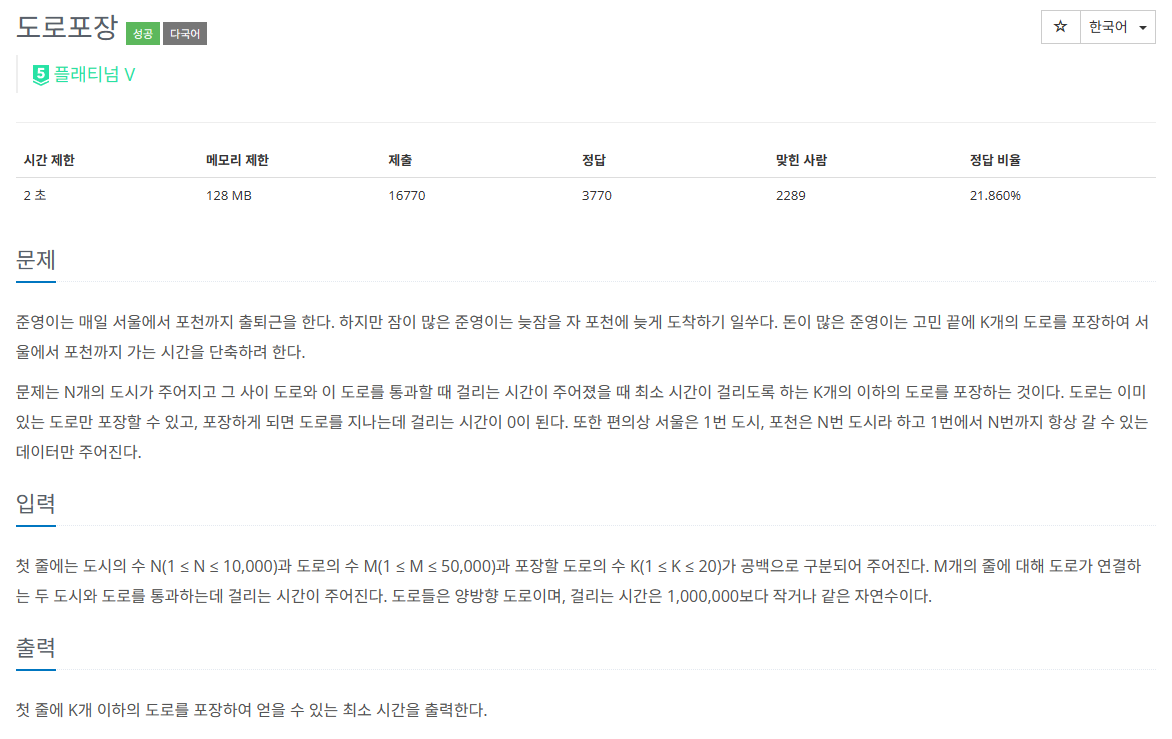다익스트라 알고리즘에 DP가 섞인 문제. 사실 DP라고 의식하지 않아도 풀다 보면 DP를 이용해서 풀게 된다. 당연하게도 브루트포스로는 풀 수 없다. 도로 중에서 포장할 도로를 고르는 경우의 수만 해도 50,000C20까지 주어질 수 있고, 각 경우의 수마다 최소 비용도 계산해야 한다.