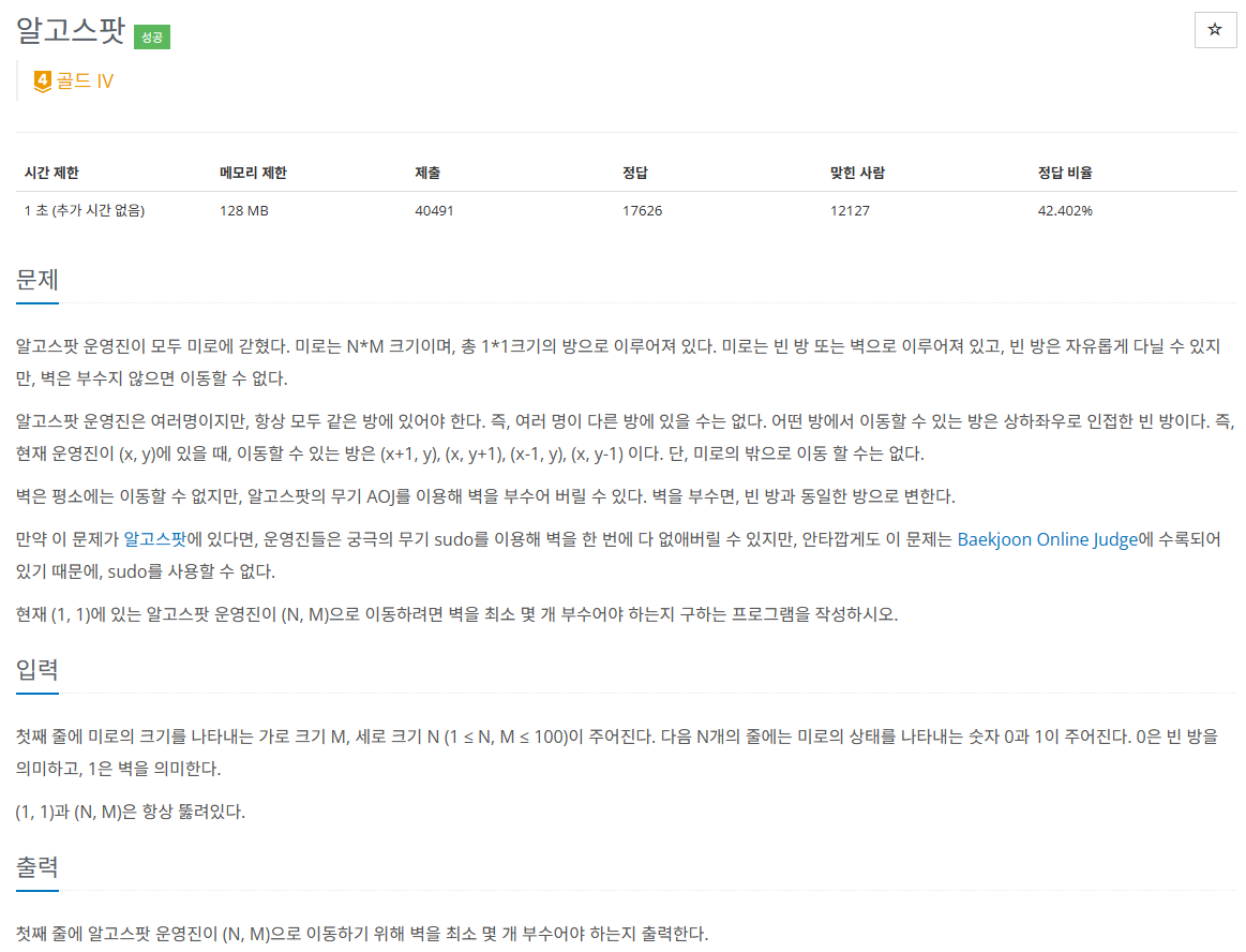 어제 맥락이 같다고 했던 유형의 문제가 바로 나왔다. 결과적으로는 다익스트라 문제긴한데, 사실 BFS(Best-First Search, 이하 BFS) 문제라고 봐도 무방하다. Best의 판단 기준은 당연히 진행하면서 부순 벽의 수이다.
