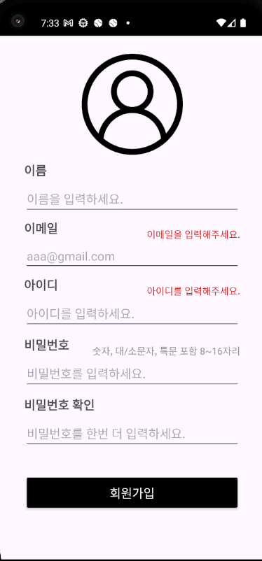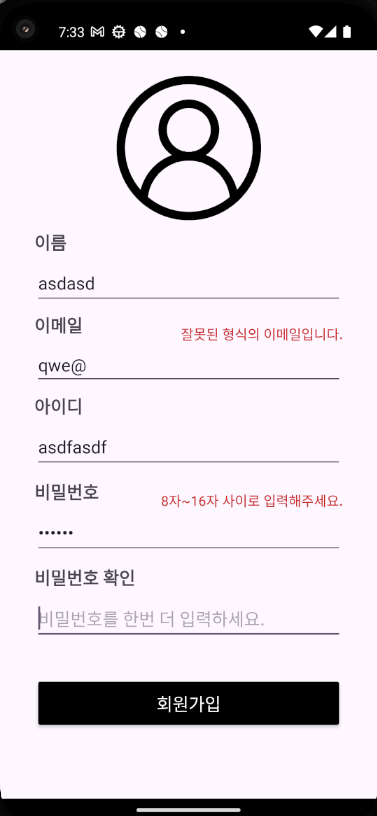 대략 이런 식인데, 이상하게 초기 상태에서 이름 쪽의 warnText가 제대로 나타나지 않는다. 뭔가 초보적인 실수가 있었던 것 같다. 또 저 버튼의 활성 상태도 바뀌도록 해야하고, EditText의 focus 여부에 따라서도 Validation을 하는 것이 요구 사항이라 아직 조금 더 손 봐야할 것 같다.