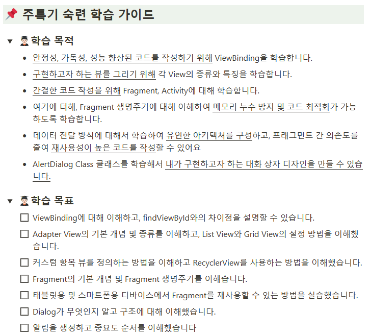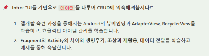 ViewBinding이나 RecyclerView, Fragment 등 안드로이드 구현의 기본기를 배우는 주차인듯 했다. 인트로에 적힌 CRUD 때문에 통신이나 DB작업도 다루게 되나 했는데 훑어보니 그건 아닌 것 같았다.