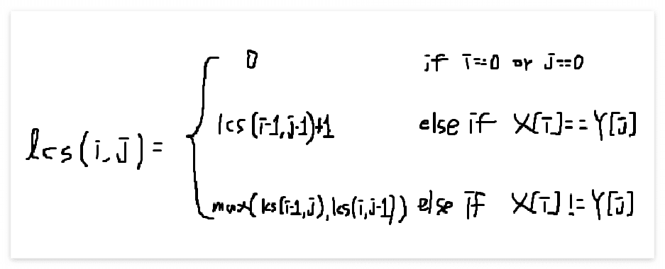 - 만약 다르다면, 새로운 LCS는 X의 끝 문자를 뗀 경우와 Y의 끝 문자를 뗀 경우로 다시 생각해볼 수 있을 것이다.