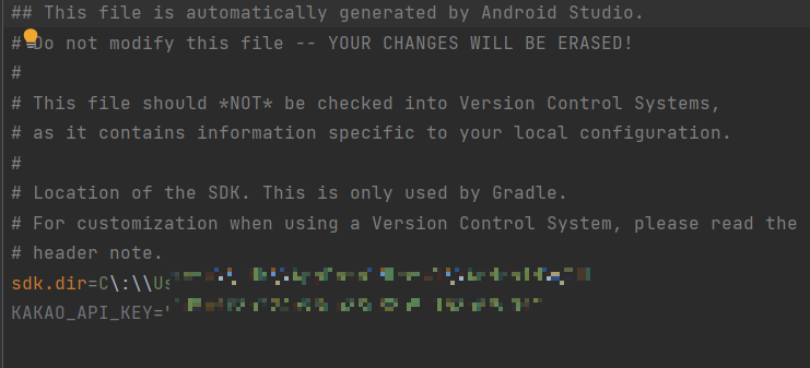local.properties에 키 값을 이름=문자열 꼴로 작성한다. 당연히 이 파일은 형상 관리 시스템에서 제외되어야 한다.