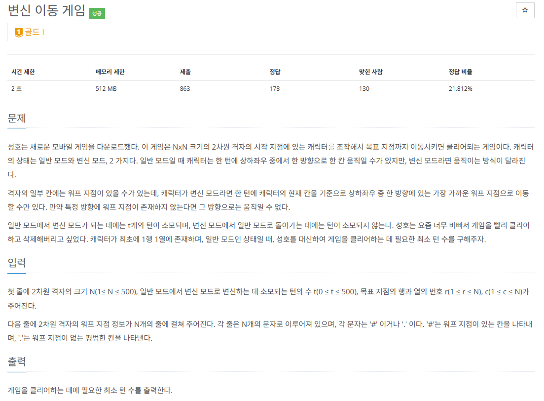 격자의 최대 크기가 500*500으로 작았기 때문에 BFS로 접근했는데, 일단 당연하게도 방문 정보를 저장할 때는 단순하게 방문여부만 저장해서는 안된다. 일반 모드일 때와 변신 모드일 때로 나누어 저장해야 하고, 이전까지 있었던 방문 비용 최소치를 담아두기로 했다.