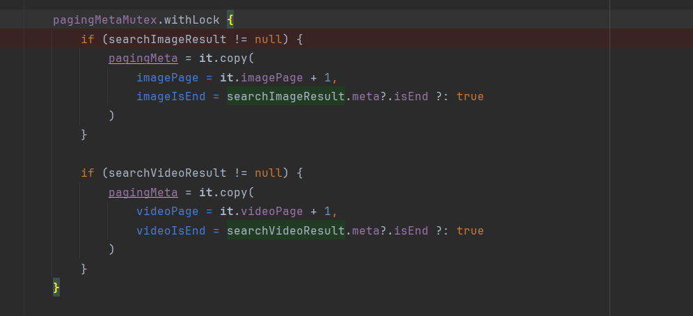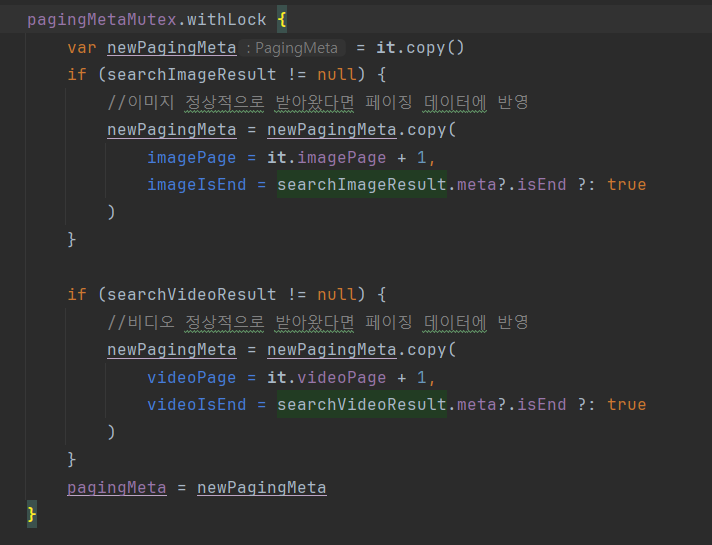 loadMore()이 호출되면 분명 정의해 둔 pagingMeta가 갱신되어야 하는데, pagingMeta의 이미지 관련 데이터는 전혀 갱신되지 않고 있었다. 해당 메소드는 pagingMeta가 null인지 확인하기 위해 pagingMeta?.let {} 블럭 내에서 로직을 실행하는데, 위의 이미지처럼 pagingMeta를 it을 copy해 갱신하고 있었다.