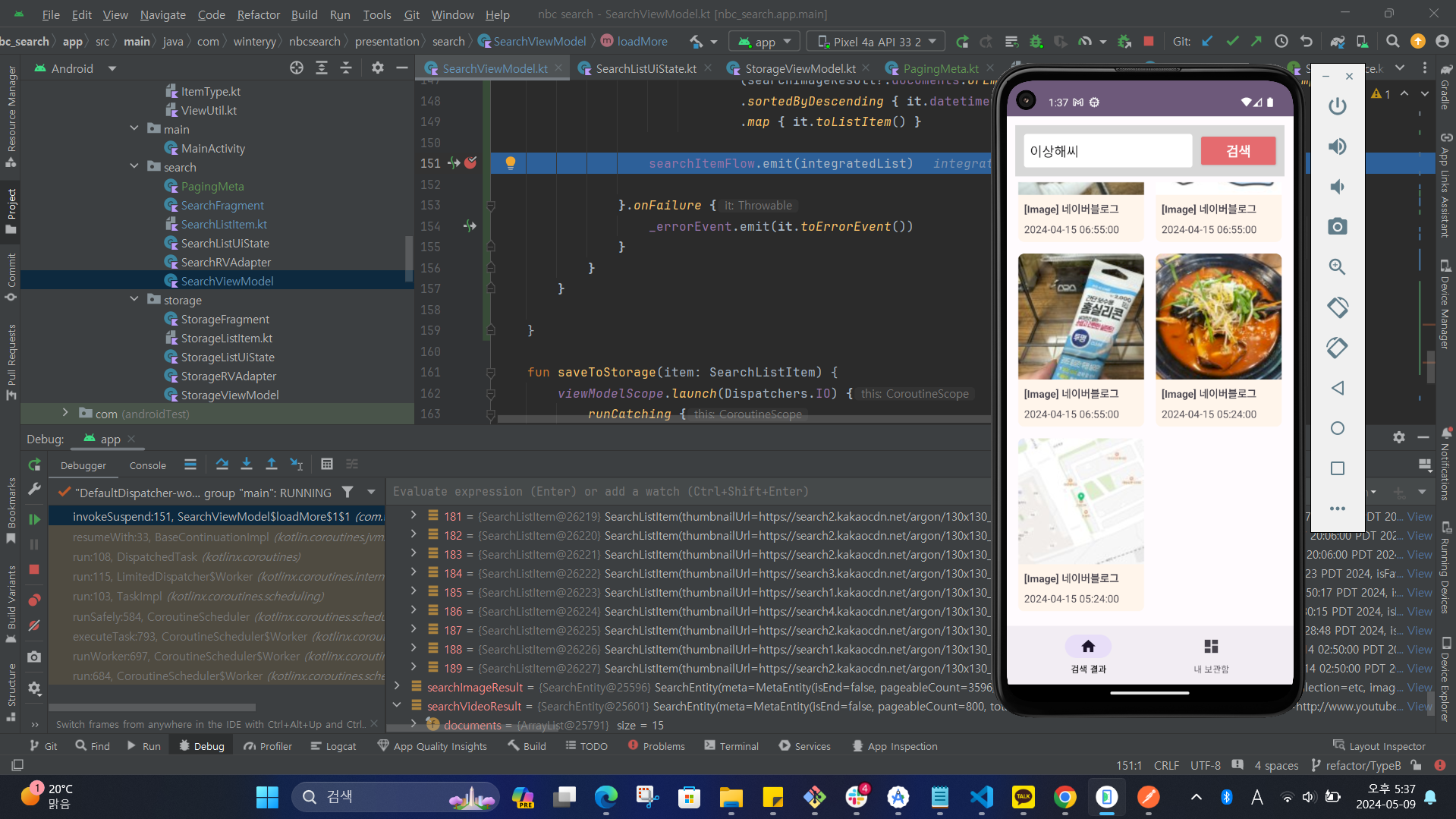점점 더 의문만 늘었는데, 일단 load시에 문제가 발생하는 건 확실해보여서, 직접 ViewModel 내에 구현해 둔 페이징 로직과 loadMore() 메소드를 확인하기 시작했다. 디버거를 돌리며 한 줄씩 따라가다 보니, 이미지 API 결과 값만 1페이지 값을 계속해서 가져옴을 확인했고, 문제의 원인도 찾아냈다.