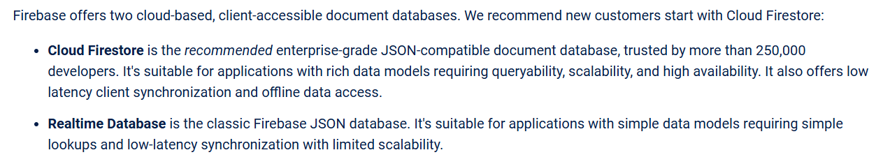 Firebase에서는 두 가지 DB를 제공하는데, Cloud Firestore와 Realtime Database이다. 설명에도 나와있듯이, Realtime Database는 Firebase의 클래식한 JSON DB이며, 간단한 데이터들을 낮은 레이턴시로 동기화 하는 것에 유리하다. Cloud Firestore는 비교적 최신에 나온 DB인데, 기존 Realtime Database의 약점이었던, 복잡한 쿼리나 확장성, 높은 가용성 등에 메리트가 있다고 한다. 물론 이 또한 낮은 레이턴시의 동기화나 오프라인 데이터 액세스를 제공한다고 한다.