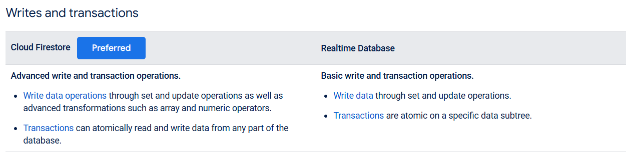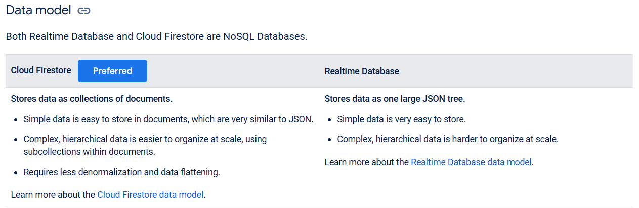 Choose a database: Cloud Firestore or Realtime Database | Firebase (google.com)
