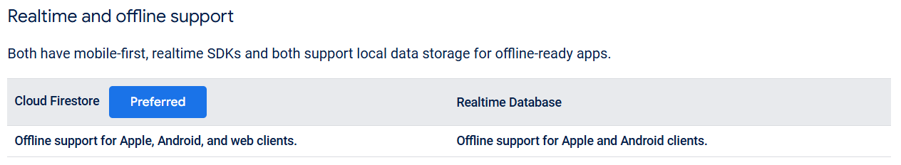 Realtime and offline support - 둘 다, 모바일 환경에 최적화된 realtime SDK를 가지고 있고, 로컬 캐싱을 통한 오프라인 상태의 앱을 지원하는 수단도 보유하고 있다. Cloud Firestore의 경우, 웹 클라이언트에서의 오프라인 지원도 가능하다는데 나는 안드로이드 앱을 개발하는 입장이기 때문에 이 부분에서는 큰 차이를 못 느낄 것 같다.