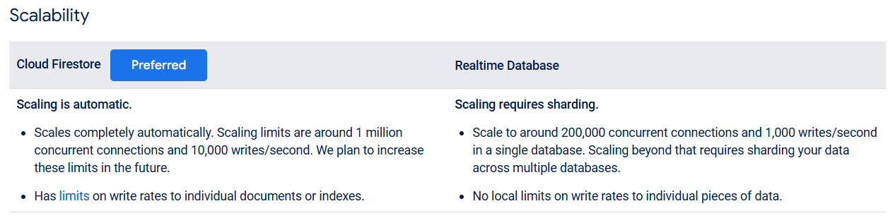 Scalability - Cloud Firestore는 Scaling이 자동으로 일어난다고 한다. 그래서 그냥 방치했을 때는 동시 연결이나 초 당 쓰기량은 Cloud Firestore 쪽이 우세하다. 다만 Realtime Database에서도 직접 복수 개의 데이터베이스를 이용해 확장한다면 이는 어느정도 커버할 수 있는 문제로 보인다.