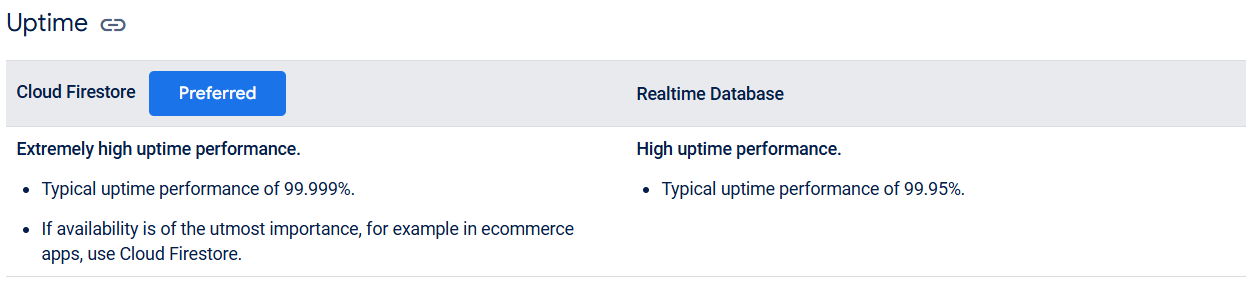 Uptime - Cloud Firestore 쪽이 극한의 업타임을 보장하고 있다. 그래서 금융 결제 앱 등은 Cloud Firestore를 사용할 것을 권장하고 있다.