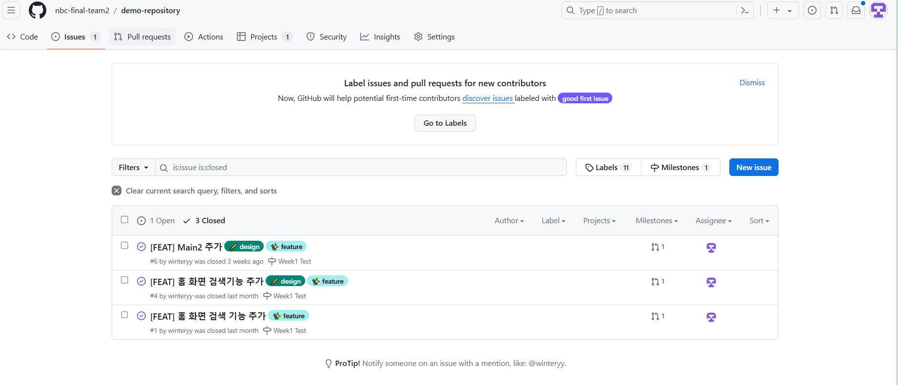 이런식으로 데모 레포지토리를 작성해, 여러 가지를 테스트 해보고 실전 프로젝트에서 사용할 label이나 issue template도 이 때 거의 작성해두었다.