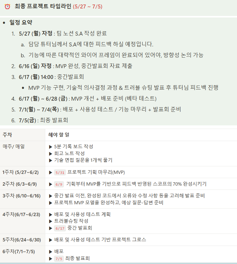 이전에 최종 프로젝트 리더를 지원해둔 상태였는데, 위와 같은 스케줄을 뒤늦게 알게 돼서 꽤나 막막했다. 6주를 모두 개발에 사용해야 만족스러운 기능과 견고함이 보장될 것 같았는데, 3주 만에 기본적인 기능을 갖추고 스토어에 심사를 올리고 중간발표도 준비해야 했다. 엎친데 덮친 격으로 5/28~5/31 기간 동안 나는 예비군 훈련이 예정되어 있었다.