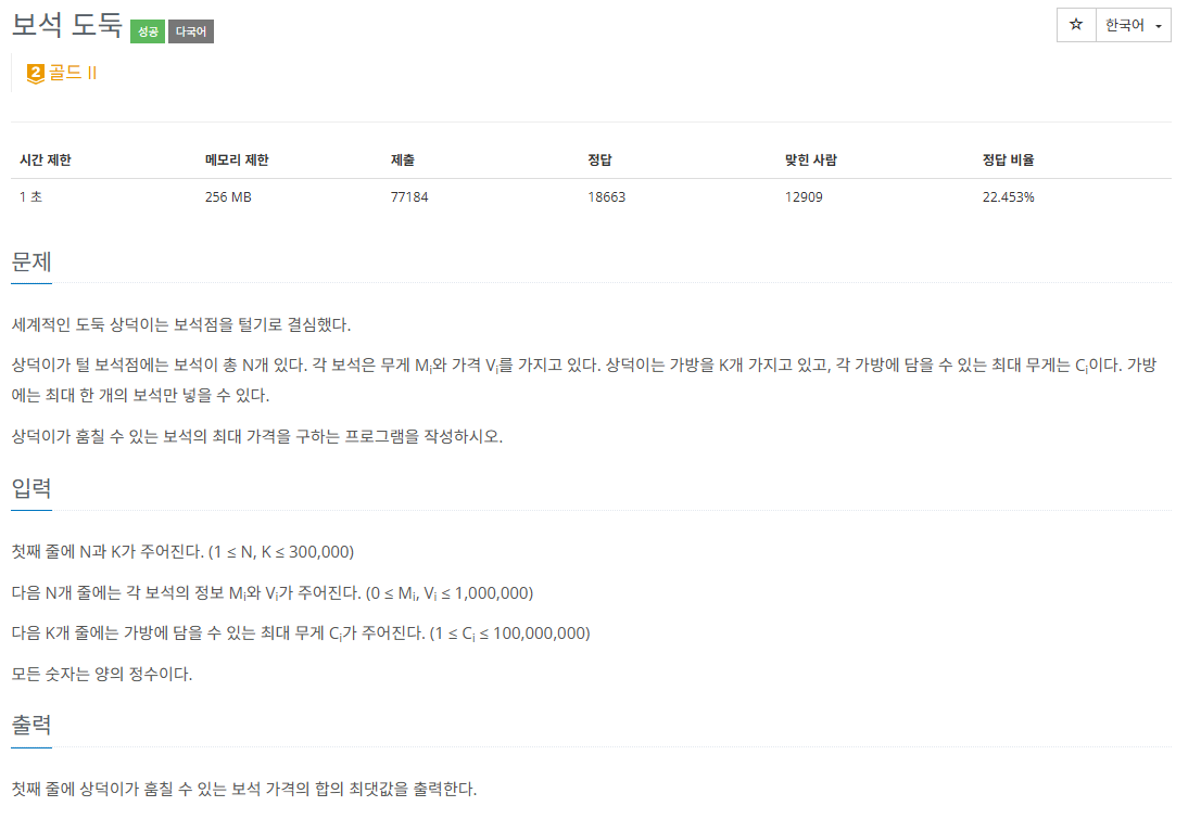 문제가 심플하면서 묻고 있는 것이 명확하다. 그런데 알고리즘 문제를 너무 오랜만에 풀었더니 이 문제에서도 꽤 난항을 겪었다. 당연히 보석과 가방 리스트를 그대로 이용하게 되면 절대 제한 시간 안에 풀 수 없다. 그래서 가방을 내림차순으로 정렬하고, 우선순위 큐를 통해 보석을 가치가 크면서 무거운 보석이 먼저 나오도록 해두고 접근해봤다.
