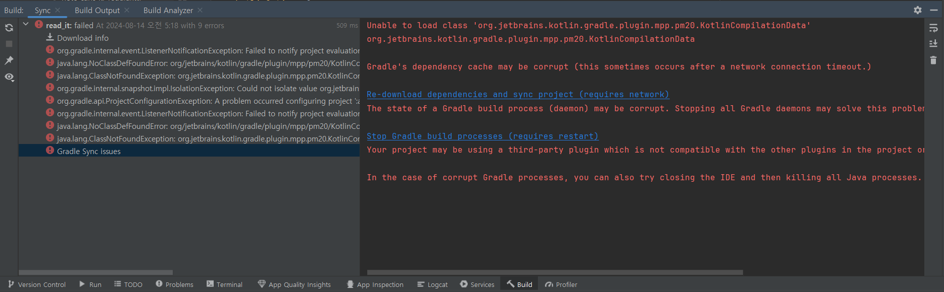 Unable to load class 'org.jetbrains.kotlin.gradle.plugin.mpp.pm20.KotlinCompilationData'