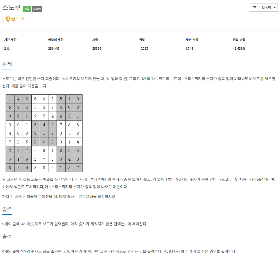 단순 구현문제이다. 직관적으로 떠오르는 로직을 그대로 적용하게 되면 자연스럽게 백트래킹과 적당한 분기처리를 통해 풀게 된다. 탐색시간을 최대한 줄이기 위해서, 나는 가로줄, 세로줄, 3*3칸에 대해서 특정 숫자가 등장했는지 여부를 저장해두는 배열을 따로 생성해 이용했다.