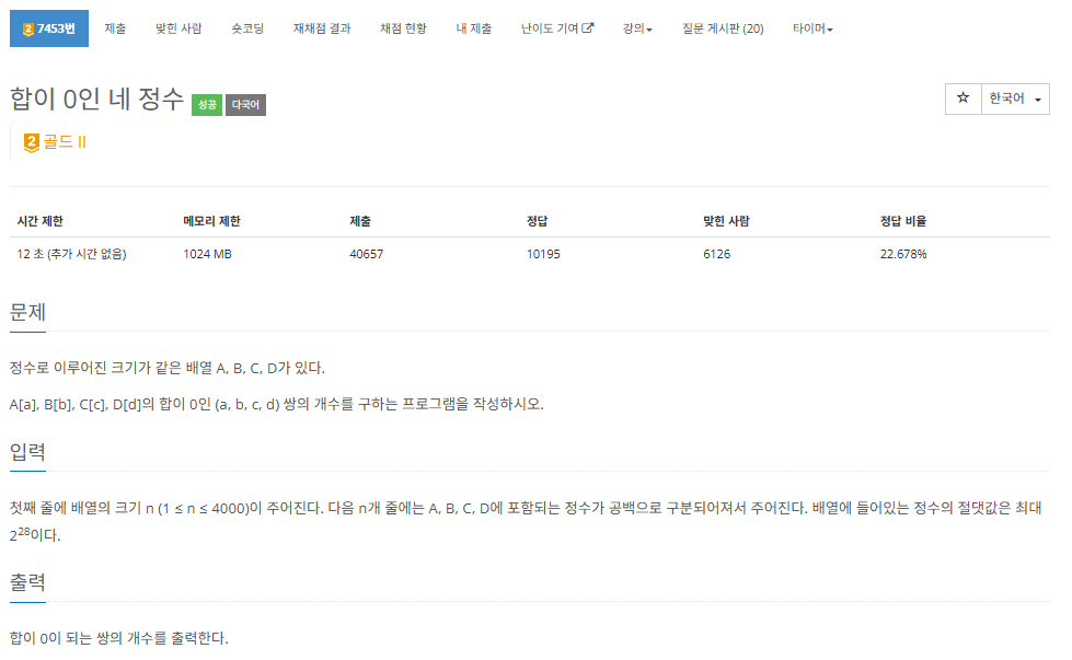 로직은 두 가지를 적용해 볼 수 있다. 먼저 투 포인터를 이용하는 방법이다. A, B, C, D 배열을 두 쌍으로 나누어 각각의 값을 교차시켜 더했을 때 나오는 결괏값 배열을 생성한다(O(n^2)). 그리고 생성된 두 합 배열을 정렬한다(O(n log n)). 이후엔 투 포인터를 이용해 하나의 배열은 시작점, 하나의 배열은 끝점부터 탐색하며 0이 되는 값을 찾아 나간다.(O(n^2)) 이때, 종료조건은 둘 중 한 배열을 가리키는 포인터가 반대쪽 끝에 도달했을 때로 설정해 두고, 더해서 0이 되는 모든 경우를 끝까지 탐색할 수 있도록 한다.